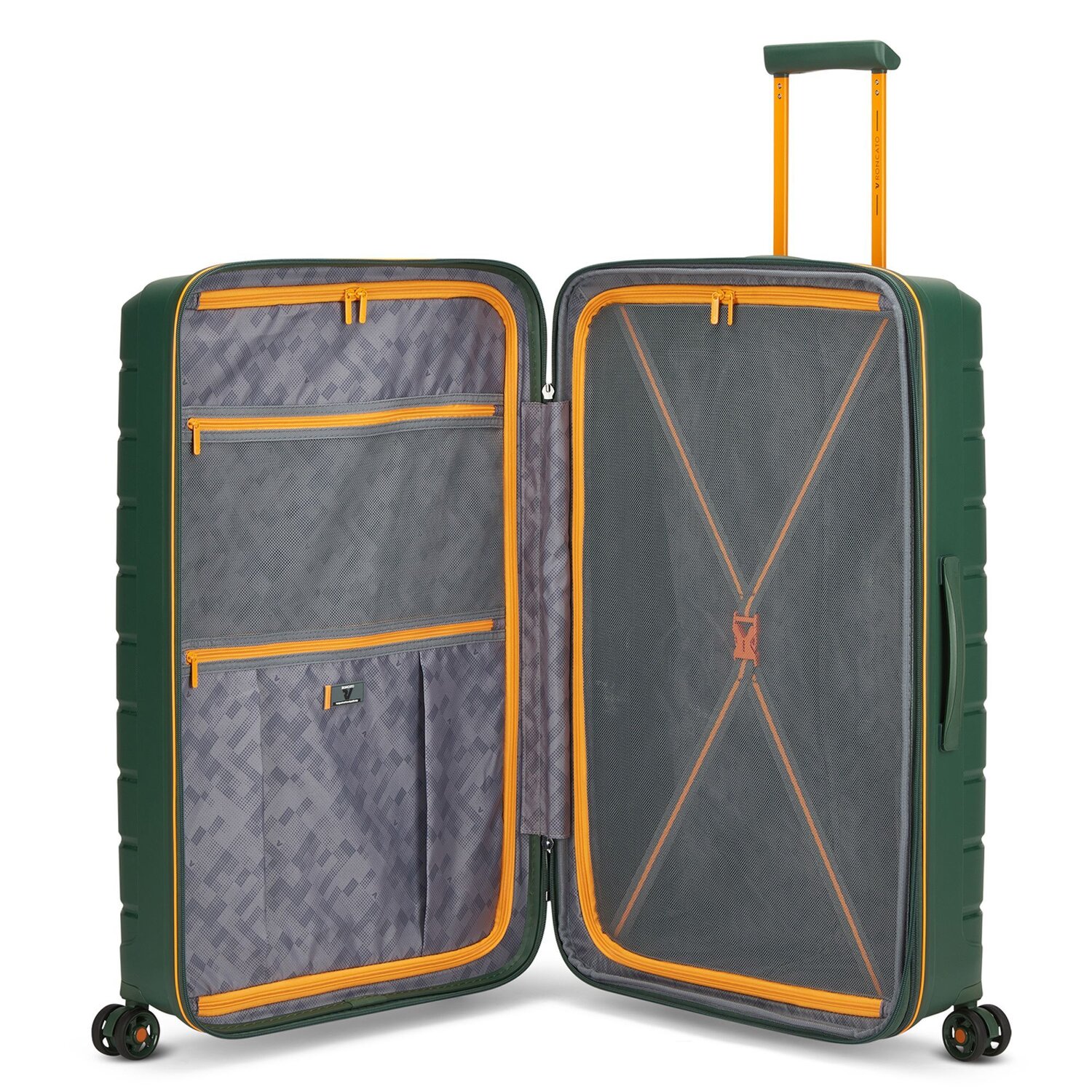 Felgekleurde koffer met apart gekleurde bies. Indeling is symmetrisch met aan beide zijden een net met rits. Net klapt naar buiten open. En de koffer is lichtgewicht!